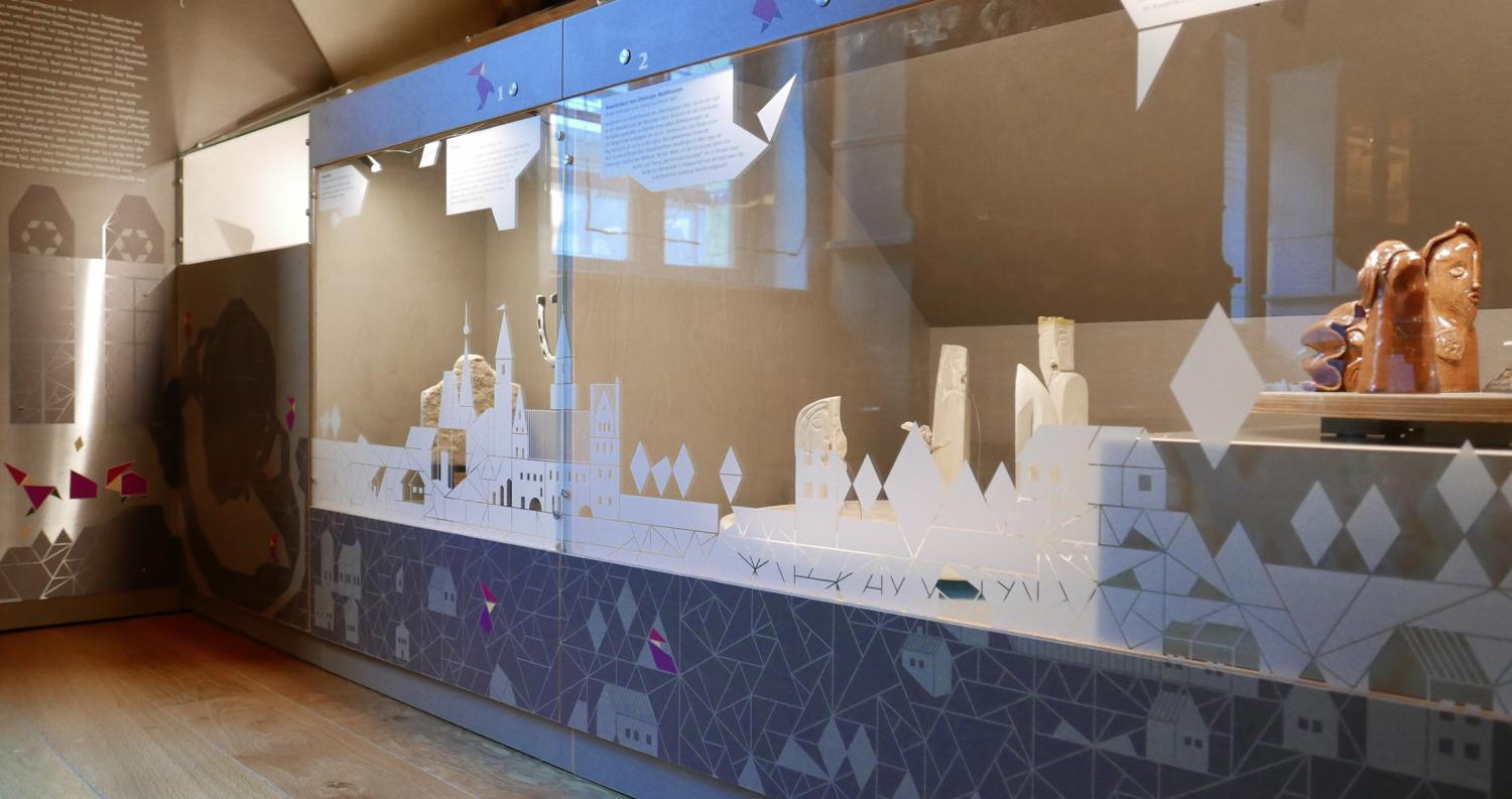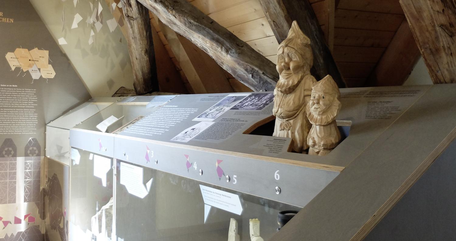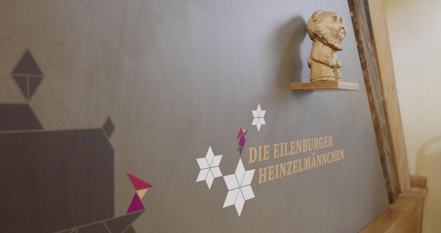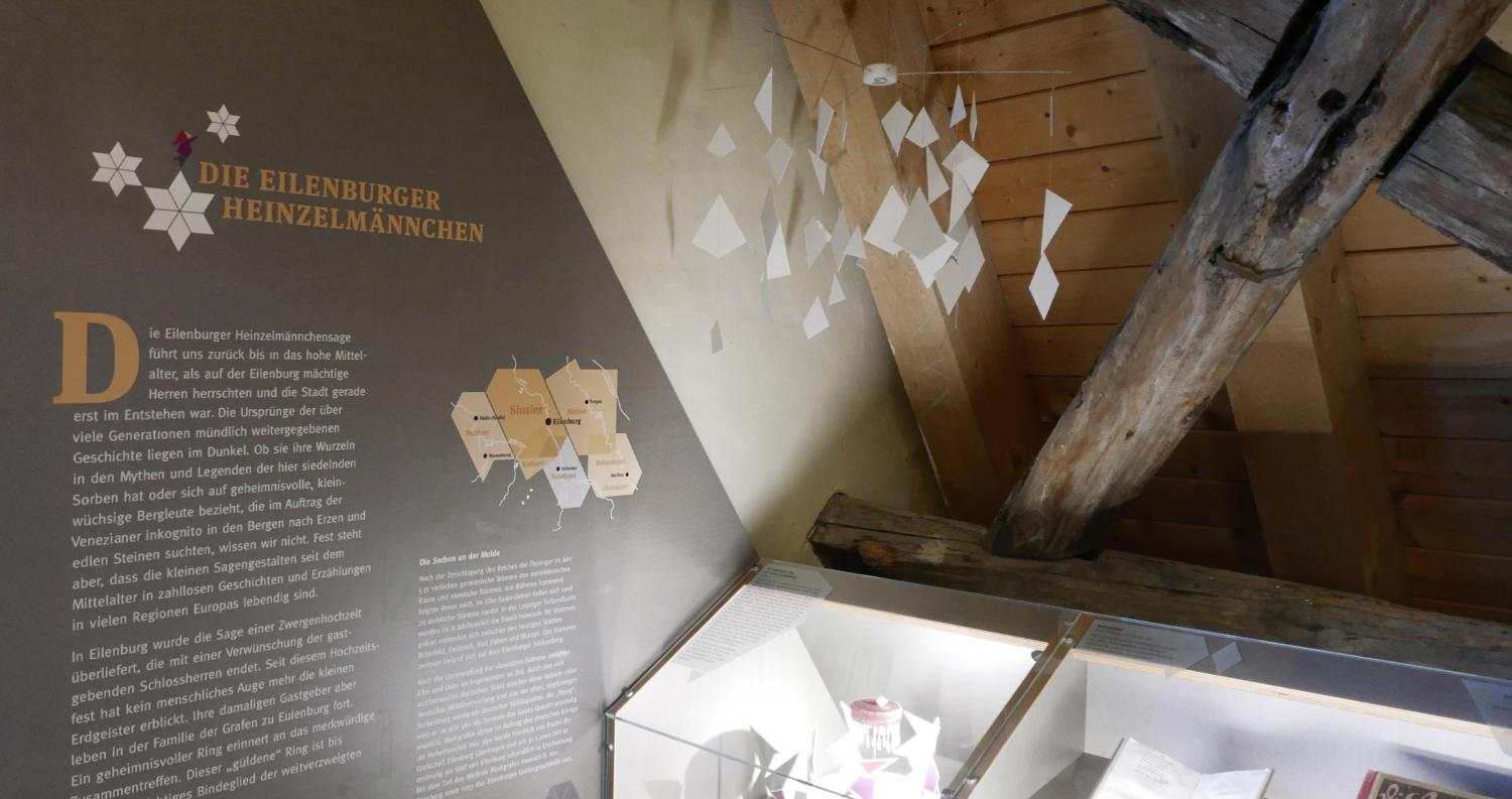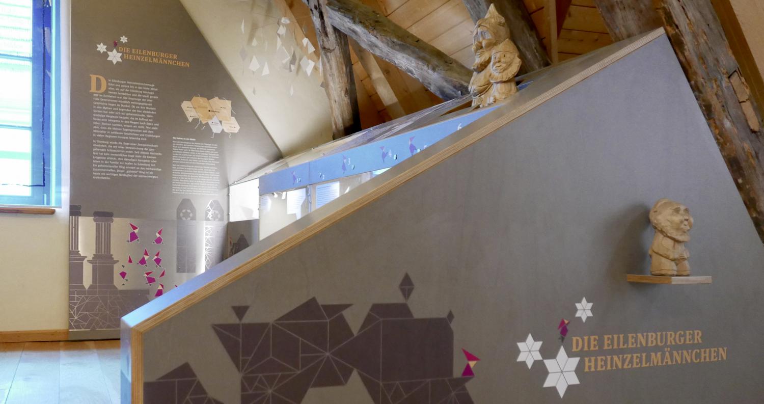 Die Heinzelmännchen bekommen einen festen Platz im Eilenburger Stadtmuseum. Die für die Sonderausstellung 2017 entwickelten Grafiken sind die Grundlage für die Gestaltung der neuen Vitrine, die sich in die vorhandene Struktur des Dachgeschosses einschmiegt und einige der damals gezeigten Objekte aufnimmt: insbesondere den sagenhaften Ring auf der sich drehenden Zwergenpyramide.